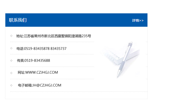 傳真:0519-83435688    郵編:213135    網址:WWW.czjhgj_com.1ojqka.com    電子郵箱:JH@czjhgj_com.1ojqka.com